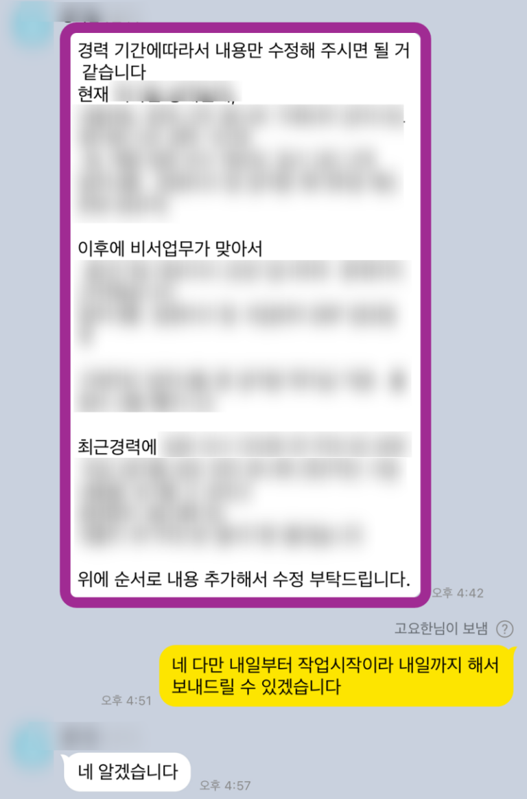 자기소개서 자소서첨삭 합격후기 자기소개서 자소서첨삭 합격후기 안녕하세요! 여러분의 성공적인 취업을 돕는 자기소개서 컨설턴트입니다. 저는 매년 2000명 이상의 자소서 컨설팅을 진행하고 있으며, 첨삭 및 대필을 통해 수많은 분들의 꿈을 현실로 만들어 드리고 있습니다. 이번에는 특히 자기소개서 작성에 어려움을 겪으셨던 지원자분의 합격 후기를 공유하며, 생생한 첨삭 과정을 보여드리려고 합니다. 솔직히 말씀드리면, 이번 고객님은 정말 간절하셨어요. 그래서 저도 …