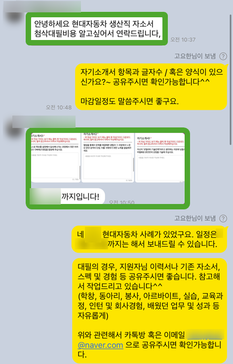 현대자동차 자소서 첨삭 대필 합격후기 안녕하세요! 현대자동차 채용 시즌, 다들 자소서 준비로 정신 없으시죠? 솔직히 현대자동차처럼 쟁쟁한 기업은 자소서부터가 넘어야 할 산이잖아요. 저는 매년 2000명 이상의 자소서 컨설팅을 진행하고 있고, 수백 건의 대기업, 공기업 합격 사례를 보유하고 있는 자소서 첨삭/대필 전문가입니다. 특히 현대자동차 합격 사례도 정말 많아요! 이번에 제가 직접 첨삭하고 대필까지 진행해서 합격하신 분의 …